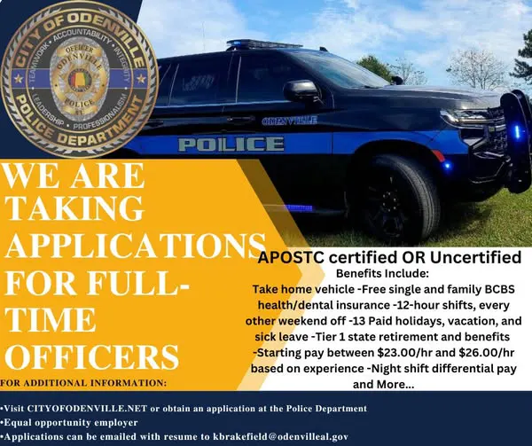 OPD is Hiring! Odenville Police Department is accepting applications for full-time officers. For additional information, visit our website or obtain an application at the Police Department.