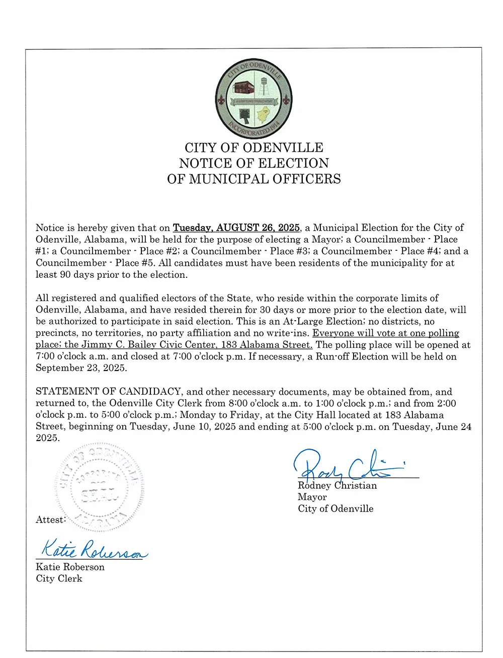 City of Odenville Notice of Election of Municipal Officers