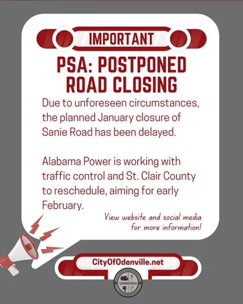 Due to some unforeseen circumstances, the planned January closure of Sanie Road has been delayed. Alabama Power is working with traffic control and St. Clair County to reschedule, aiming for early February.